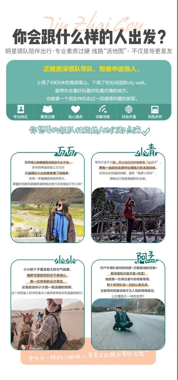 私人訂制:我們業我們客戶范圍囊括了全國各大城市,川西、西北、東北,皖南,貴州,在路上永遠有我們的身影。我們將為每一個有定制需求的你策劃出獨屬于自己的完美旅行。