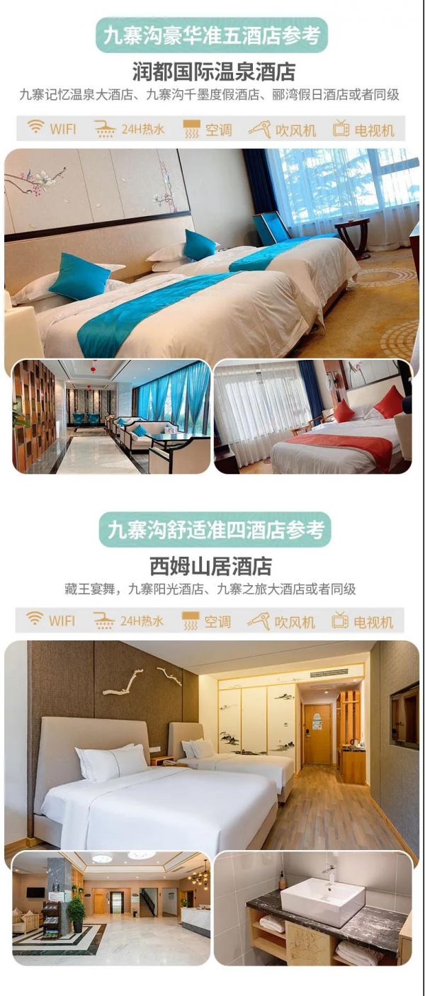豪華準五:九寨記憶溫泉大酒店,潤都國際溫泉酒店,九寨溝千墨度假酒店、酈灣假日酒店或者同級