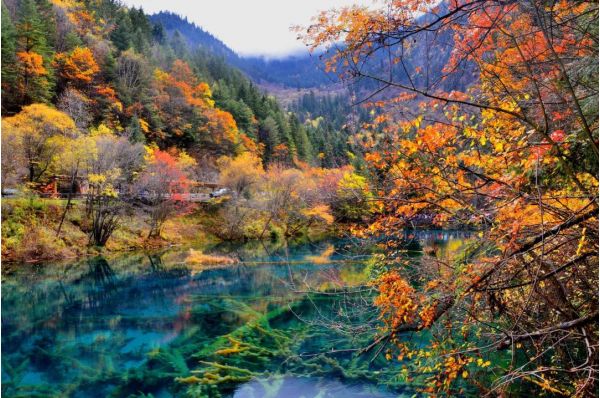 隨著季節的變化,九寨溝也呈現出不一樣的風姿。初春時節,各色杜鵑、山桃花、野梨花相繼吐艷,夾雜著嫩綠的樹木新葉,整個林海繁花似錦;盛夏則是一場綠的聚會,新綠、翠綠、濃綠、黛綠,豐富而富有旺盛的生命力;深秋的九寨溝更是享譽世界,只見漸次經霜的彩林深淺相間、錯落有致,是“萬山紅遍,層林盡染”的最佳寫照,在漫山遍野濃烈的紅襯托之下,碧水更綠、藍天更藍,呈現出光怪陸離的水景;待入冬,莽莽林海都覆上皚皚白雪,林海雪原似玉樹瓊花,潔白、高雅,是觀賞九寨六絕之“藍冰”和“雪峰”的最好時機。