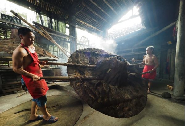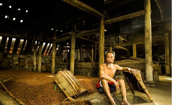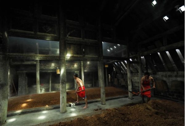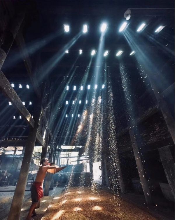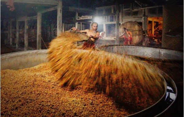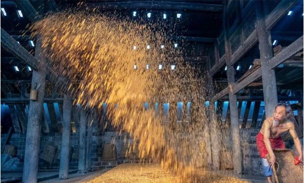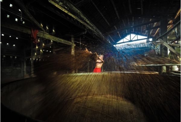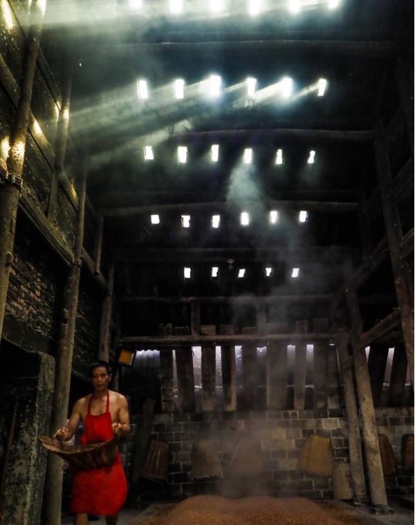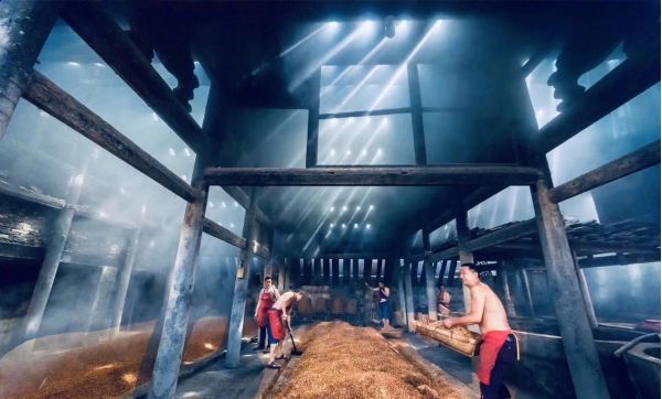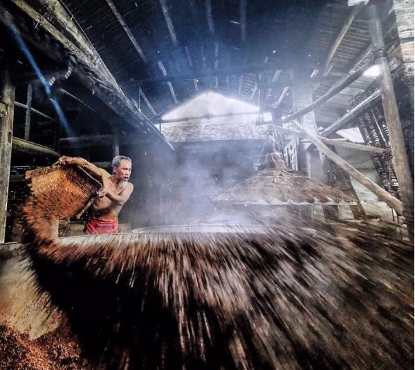 拍攝有著百年歷史的傳統手工藝—泡子酒,迎合著紅高粱霧蒙蒙蒸汽,仿佛置身于行宮騰云般壯觀。烤酒師傅們端著酒糟穿梭行走,或激情揮灑酒曲之間,所到之處,散發著一種勞動之美,力量之美。將近午時光束穿透老屋頂,投射到古老的作坊,這里便是暈染了熱騰騰的場景。