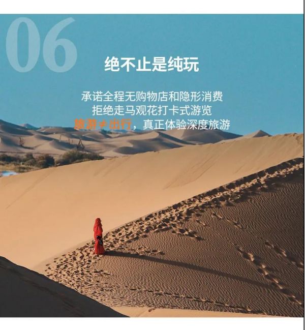 5、甘肅及額濟(jì)納旗環(huán)境受限,當(dāng)?shù)鼐频昙安惋嫍l件無法與城市相比,請(qǐng)游客做好心理準(zhǔn)備;賓館內(nèi)可能無牙膏牙刷、拖鞋等一次性衛(wèi)生用品,請(qǐng)自備個(gè)人衛(wèi)生用品;沿途商店較少,民俗習(xí)慣亦有不同,游客可自備咸菜、小吃、干糧等零食,以備不時(shí)之需。