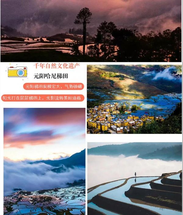 后參觀【菁口梯田】:千年來哈尼族人民一厘一寸開墾耕耘出來的大地的五線譜。參觀哈尼特色民族蘑菇房,狀如蘑菇,與巍峨的山峰,迷人的云海、多姿的梯田,構成了一幅奇妙的哀牢山壯景 。