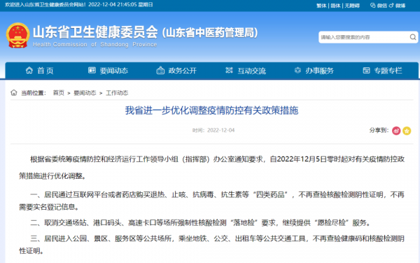 根據(jù)省委統(tǒng)籌疫情防控和經(jīng)濟(jì)運(yùn)行工作領(lǐng)導(dǎo)小組(指揮部)辦公室通知要求,自2022年12月5日零時(shí)起對有關(guān)疫情防控政策措施進(jìn)行優(yōu)化調(diào)整。