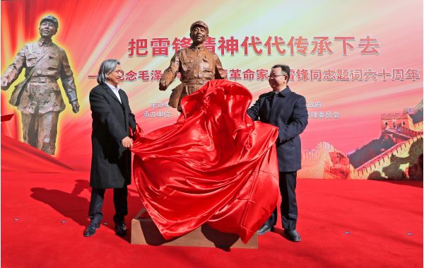 活動現場,全國政協常委、民盟中央副主席、中國美術館館長、中國美協副主席吳為山與東城區委書記孫新軍共同為雷鋒同志銅像揭幕