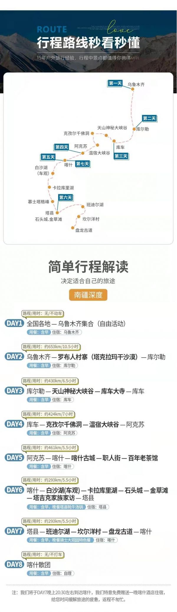 當天車程較長,從北疆穿越天山甘溝進入南疆腹地,氣候變化較大,請適當增減衣物,注意補充水分??商崆百徺I一些零食,以備不時之需。