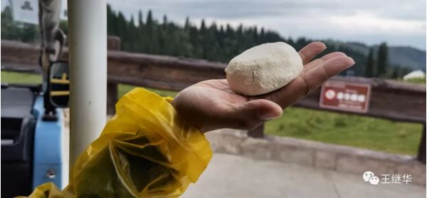 我們吃完羊肉串,每人又要了一杯鮮牛奶然后去山頂啟動無人機放飛。這時候阿依孜爾氣喘吁吁的趕過來,遞給劉總一個白色的團子。說這是奶酪送給你的。好淳樸的孩子。
