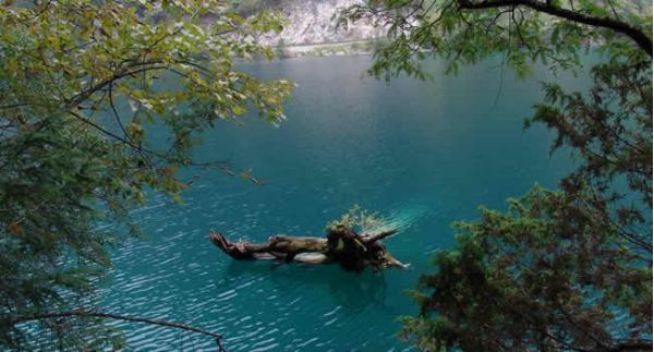 “雙龍海”在蘆葦海之上,火花海瀑布群之下,透過晶瑩的湖水,可以看到海中有兩條帶狀的生物鈣華礁堤隱隱潛伏于海底,活像兩條蛟龍藏于海中,蠕蠕欲動,顧盼生風,隨時要騰空而起,飛入蒼穹。 也許是蛟龍皈依、海中太平的緣故,這里時有不少漂亮的天鵝和多情的鴛鴦小住。如果有幸,在這里可以欣賞野鴨群游和天鵝飛舞的景象,使你備增游興。樹正群海由二、三十個大小海子呈梯田狀群集而成,前后連綿數里,上下高差近百米。柏、松、杉等翠綠樹木密布于湖泊周圍。湖水自上游翻堤而過,在樹叢中穿流,跌落在下一層的海面形成疊瀑,激起銀色的浪花,喧鬧著直奔下游而去。這一道道的疊瀑與激流串起樹正海中的各個海子,動靜相隔。群海不僅高低層次分明,色彩也是層次分明,綠樹綠得青翠,藍海藍得濃稠,疊瀑與水花白得輕盈,尤其是那綠中套藍的色彩最為動人。
