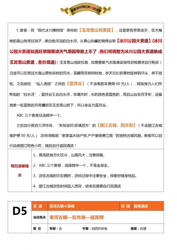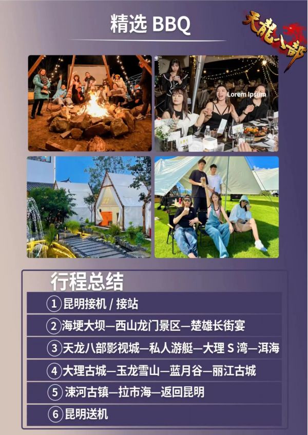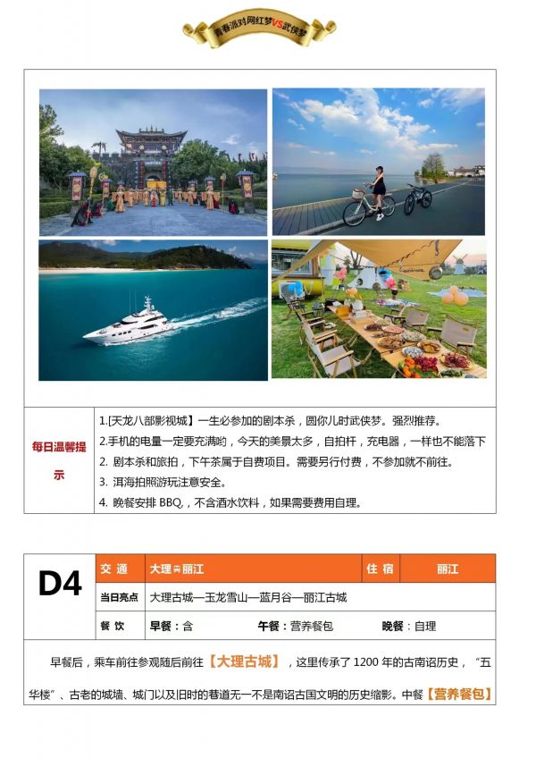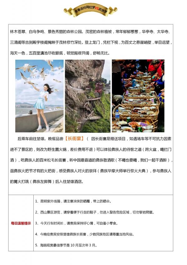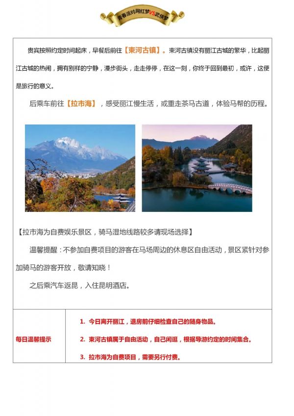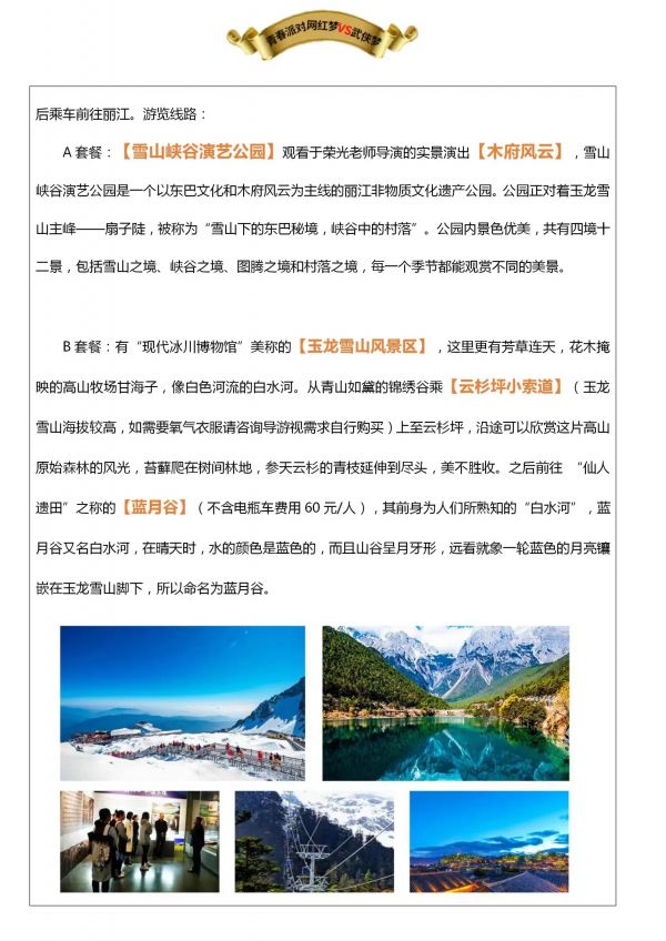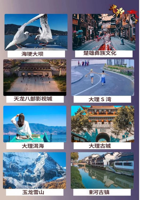 昆明-大理-麗江6日游 聊城出發 純玩 無購物 昆明接機 海埂大壩 西山龍門景區 楚雄長街宴 天龍八部影視城 私人游艇 大理S灣 洱海 大理古城 玉龍雪山 藍月谷 麗江古城 涑河古鎮 拉市海 發團日期 20230610 20230616 價格 3580 3780 3980 報名電話 0635 8681234