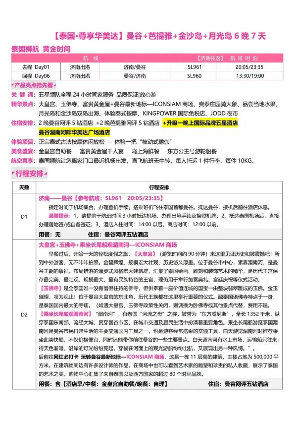 泰國7天6夜游 聊城出發(fā) 純玩 無購物 曼谷 芭堤雅 珊瑚島 金沙島 ...... 出團日期 20230610 價格 3180 報名電話 0635 8681234