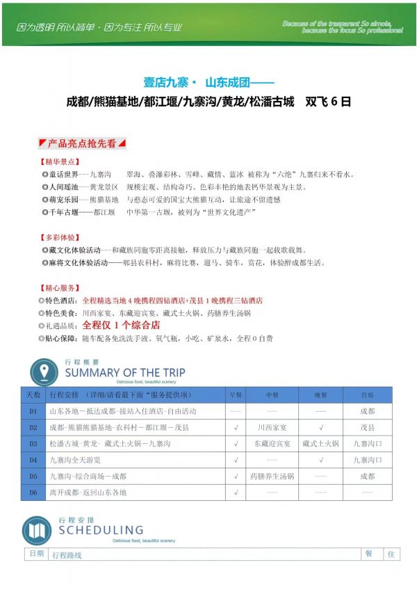 九寨雙飛6日游 聊城發團 純玩 無購物 成都 熊貓基地 都江堰 九寨溝 黃龍 松浦古城 ...... 價格 3190 3490 報名電話 0635 8681234