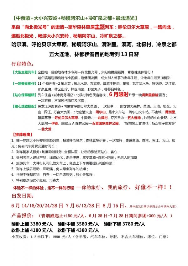 山東向北極光號主題空調專列13日游 聊城發團 純玩 無購物 哈爾濱 海拉爾 阿爾山 滿洲里 呼倫貝爾 漠河 北極村 五大連池 伊春 ...... 發團時間 20230614 20230620 20230706 20230815 價格 3380 3680 報名電話 0635 8681234