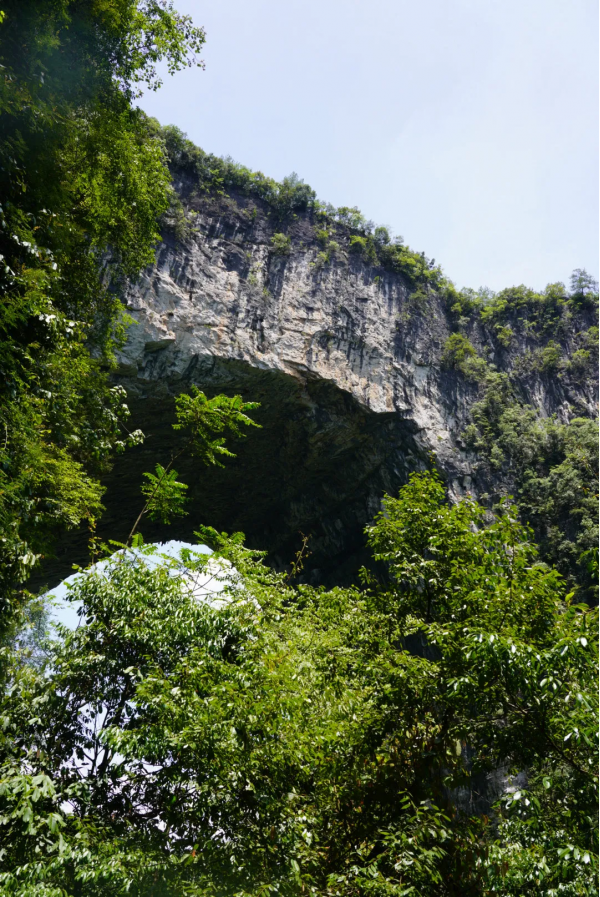 湘西的世外桃源,完全未開發的徒步路線,臨近之前的一路上還是一片平常的小山村,向下望去時赫然出現一道雄偉的天生橋地貌,與地面落差極高。當地人只稱作天生橋。因其兩邊各有一明洞,橋下還暗藏一個黑洞,由上往下的角度俯瞰極像豬鼻,于是命名“”豬鼻嶺“。