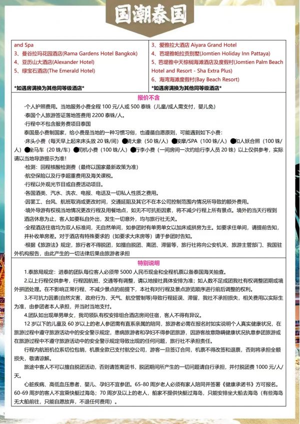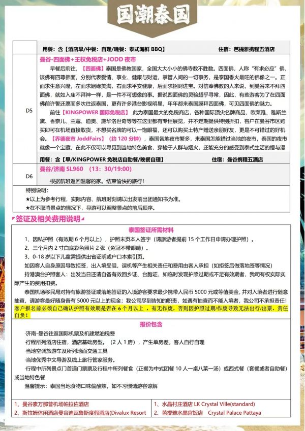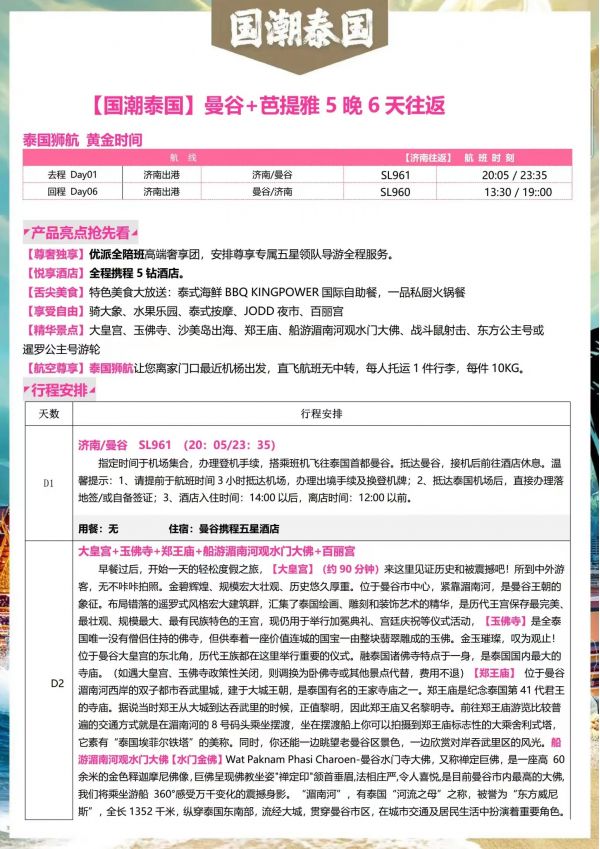 泰國6日游 聊城發團 純玩 無購物 曼谷 芭提雅 沙美島 ...... 發團時間 20230703-20230708 20230710-20230715 價格 4280 4580 報名電話 0635 8681234
