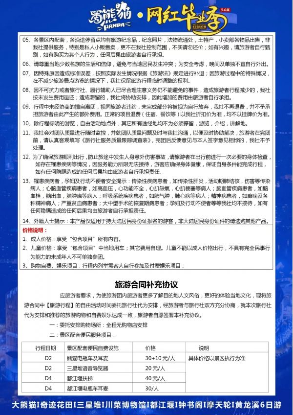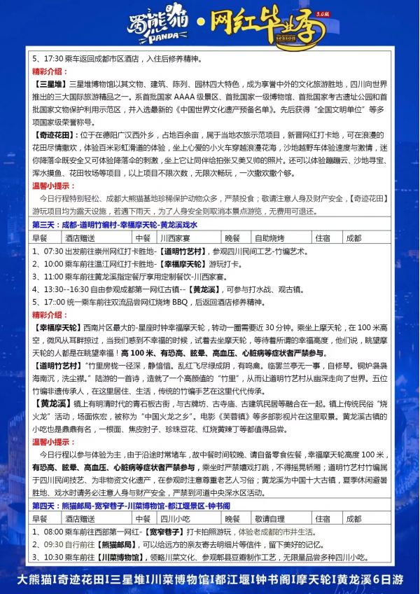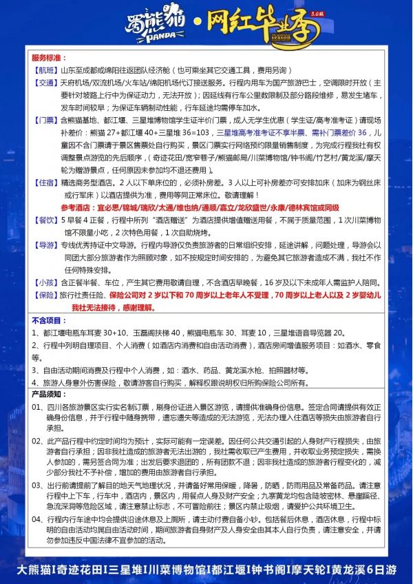 成都-蜀熊貓雙飛6日游 成都 大熊貓基地 寬窄巷子 三星堆 道明竹藝村 空港花田 黃龍溪嬉水 川菜博物館 都江堰 ...... 發(fā)團(tuán)時(shí)間 20230615 20230616 20230626 價(jià)格 3890 4090 報(bào)名電話 0635 8681234