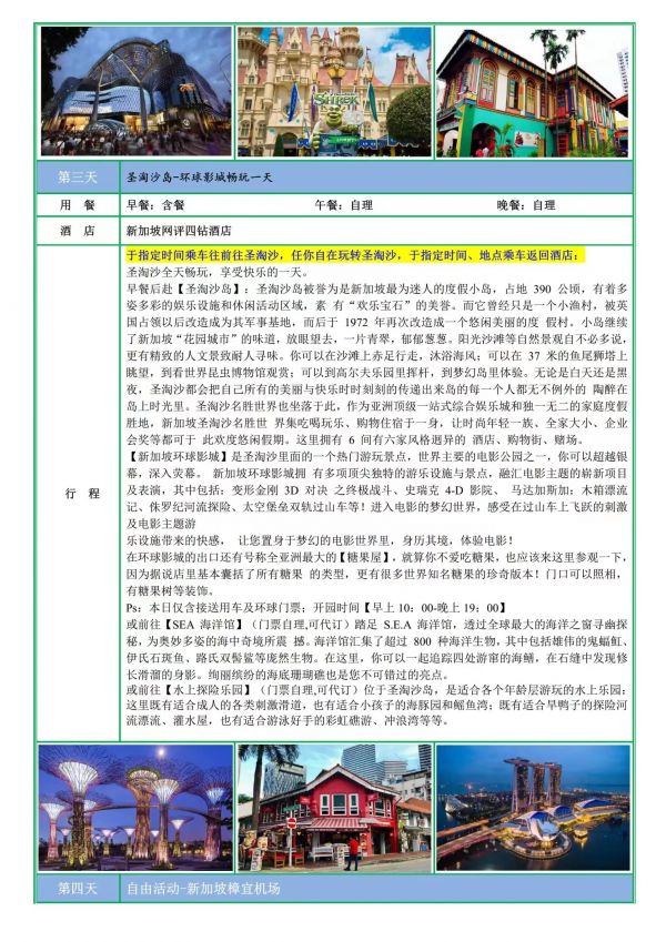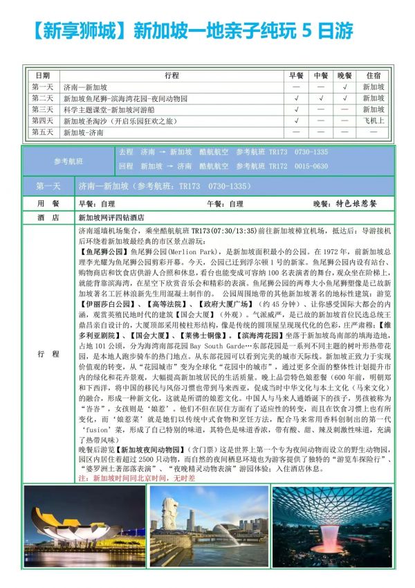 新加坡獅城雙飛5日游 聊城發團 純玩 無購物 新加坡夜間動物園 圣淘沙環球影城 圣淘沙糖果屋 ...... 發團時間 20230710 20230717 20230724 20230807 20230821 價格 8999 報名電話 0635 8681234