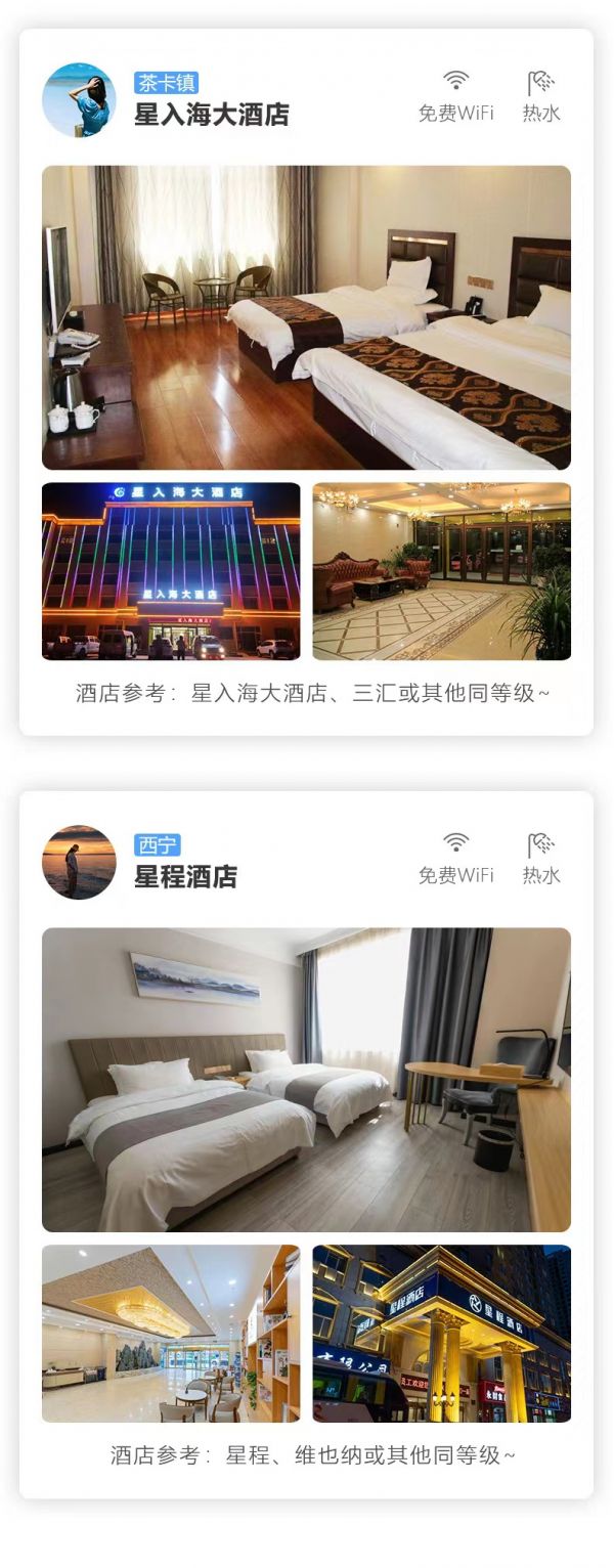 全程正規舒適旅游巴士,保證一人一正座位,車型大小根據實際人數安排,且由駕駛經驗豐富的司機為您的出行保駕護航(報價包含車費、油費、停車費、維修費及司機勞務費)。住宿:行程所列7晚住宿。我們會提供行程內展示照片的酒店或其他條件相似酒店,但因沿途條件有限,如酒店設施達不到您的期望,請您諒解。參考酒店如下: