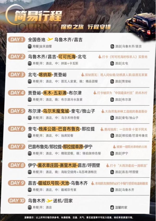 4.景點:行程中所列景點首道門票及區間(天池門票、喀納斯門票、禾木門票、可可托海門票、魔鬼城門票、五彩灘、那拉提、巴音布魯克門票)