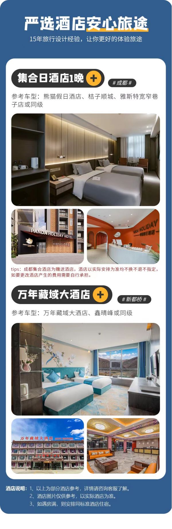 住宿:成都酒店標間1晚(tips:成都集合酒店為贈送酒店,酒店以實際安排為準均不換不退不指定,如要更改酒店產生的費用需要自行承擔。),新都橋酒店標間2晚,上木居/玉龍西客棧標間1晚 (冷噶措住宿條件有限,請謹慎報名)(僅供參考,實際以訂房為準):