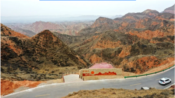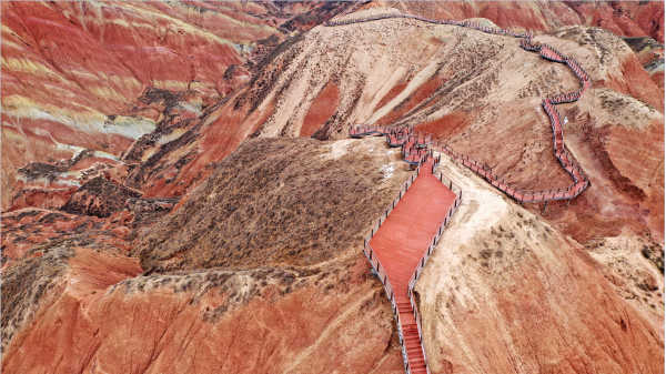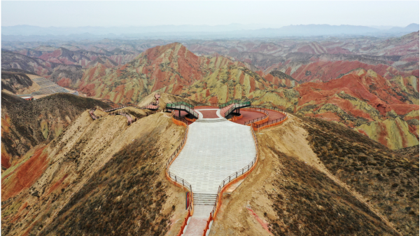 沿著棧道蜿蜒向上,隨著視角逐漸抬高眼前的水墨丹霞景區美景,絲路霞光、九色丹青、丹頂攬勝,更遠方景區的天際線盡收眼底。