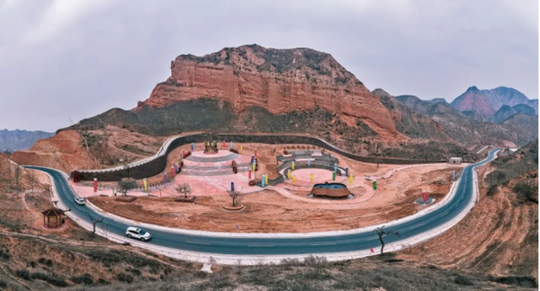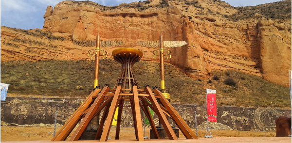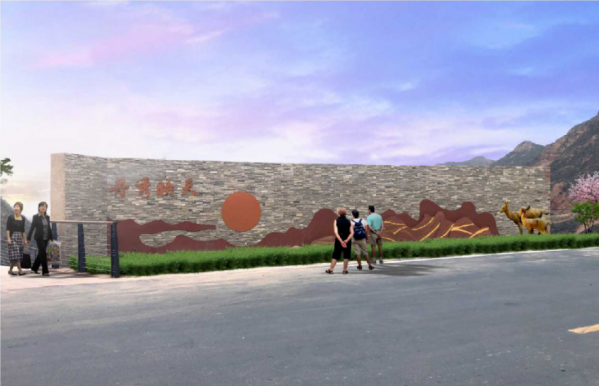 井部落文化廣場以當地出土的沙井文化古墓遺址為文化線索,結合現有的鷹巖崖壁景觀和山谷平地,以出土“”首杖的“鷹”為圖騰元素,規劃“鷹巖祭天”活動場景。這里的摩崖石刻藝術地展現了古絲綢之路的繁華盛況,可以讓人穿越時空,回味沙井文化歷史。