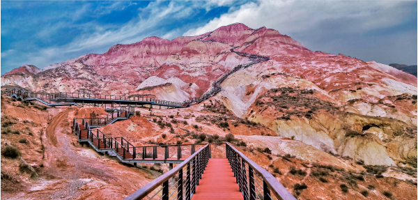 雄鷹探海,雙翼齊飛”絲路雄鷹觀景平臺海拔1841米,是景區內第一個近距離俯瞰丹霞地貌的觀景點。此處丹霞崖壁壯觀雄渾,紅山灣地貌色彩斑斕,猶如跌落人間的彩虹。既可俯瞰全貌,又可深入彩色山嵐,近觀微型石林之妙,遠賞南北兩側地質差異奇觀,是游客近距離接觸丹霞地質遺跡的最佳地點。