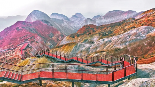 翠峰瀾天觀景平臺位于丹霞道中部,其具有觀光、休憩功能,此處為丹霞地貌的一個分水嶺,可以看到兩種不同的場景,左側山頭翠綠的碧色與右側彩色的山丘形成鮮明的對比。