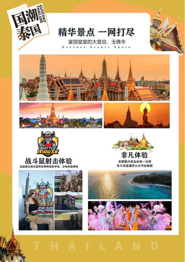 今日安排:早餐后前往,【四面佛】泰國是佛教國家,全國大大小小的佛寺數不勝數。四面佛,人稱“有求必應”佛,該佛有四尊佛面,分別代表愛情、事業、健康與財運,掌管人間的一切事務,是泰國香火最旺的佛像之一。正面求生意興隆,左面求姻緣美滿,右面求平安健康,后面求招財進寶。對信奉佛教的人來說,到曼谷來不拜四面佛,就如入廟不拜神一樣,是一件不可想象的事。據說四面佛的靈驗超乎尋常,因此,有些游客為了在四面佛前許誓還愿而多次往返泰國,更有許多港臺影視明星,年年都來泰國膜拜四面佛,可見四面佛的魅力。前往【KINGPOWER國際免稅店】 此為泰國最大的免稅商店,各種國際頂尖名牌商品,歐萊雅、雅斯蘭黛、香奈兒、蘭蔻、迪奧、施華洛世奇等等在這里都有專柜展覽,并不定期提供特別折扣,客戶在曼谷市區購買即可在機場直接取貨,不想買名牌的可以一飽眼福,還可以購買土特產贈送親朋好友,更是不可錯過的好機會。【喬德夜市JoddFairs】(約120分鐘),泰國各地夜市繁多,來泰國怎能錯過當地的夜市,泰國的夜市就像一個寶藏,在此不僅可以尋覓到當地特色美食,穿梭于人群與煙火,還能充分的感受到泰式生活的慢與漫