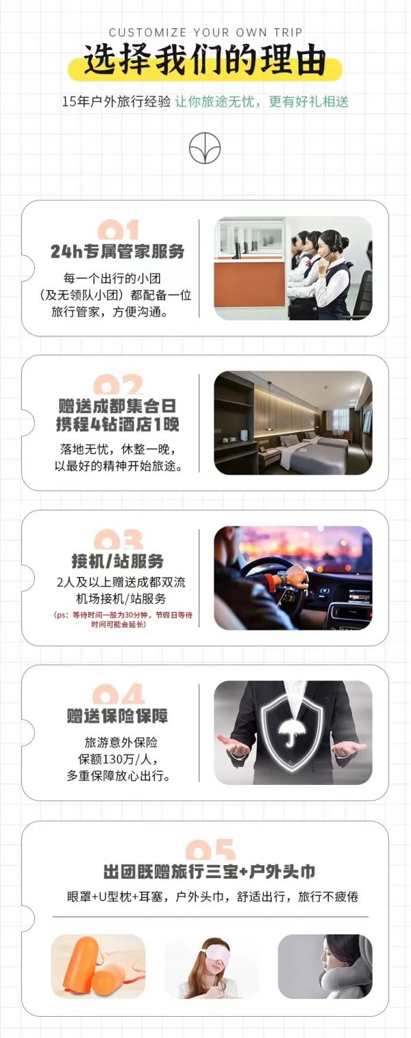 私人訂制:我們業務范圍囊括了全國各大城市,川西、西北、新疆,在路上永遠有我們的身影。我們將為每一個有定制需求的你策劃出獨屬于自己的完美旅行。