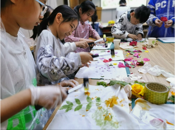扎染和拓染是我國民間特有的印染技術,是非物質文化遺產,其工藝從扎到染、從拓到染都具有豐富的創造性。首先,老師以故事的形式講解了扎染的由來及制作過程,同學們都躍躍欲試。但是在扎繩子的時候同學們卻犯了難,不知道怎么樣扎出自己想要的圖案。通過老師講解、示范,同學們有了思路,經過自己的探索,扎出了各種形狀,涂染上不同的顏料;拓染活動又引爆了同學們的興奮點,同學們揮動著錘頭,敲打著早已經準備好的花草,期待著完成后的驚喜。