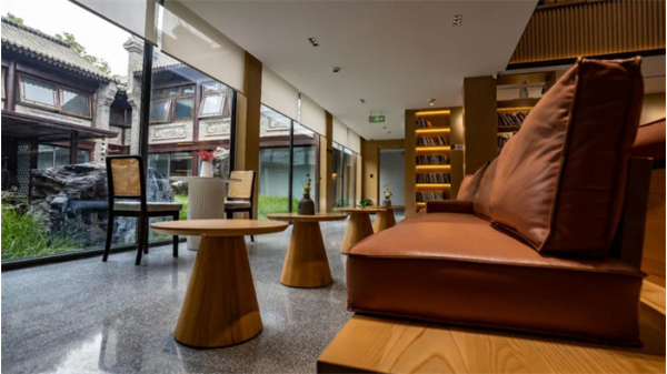 海源雅集不負其名,在設(shè)計風格上融入中國傳統(tǒng)文化的元素,取“山水相問”之意境,松柏、石橋、山水、亭榭寫意于方靜之內(nèi),呼應(yīng)“天圓地方”,極具巧思。在功能分區(qū)上,既有禪意的茶舍,又有安靜閱讀的書吧,還有較為私密的小包間,滿足不同需求。房間分別用春澤、夏嬋、雁秋、冬歸用作包間的名稱,特別有禪意。酒店的大廳就是書房,一頁頁書本形狀的吊燈,像一片片潔白輕盈的羽毛掛在房頂,讓人望之生靜,整顆心都安靜下來。