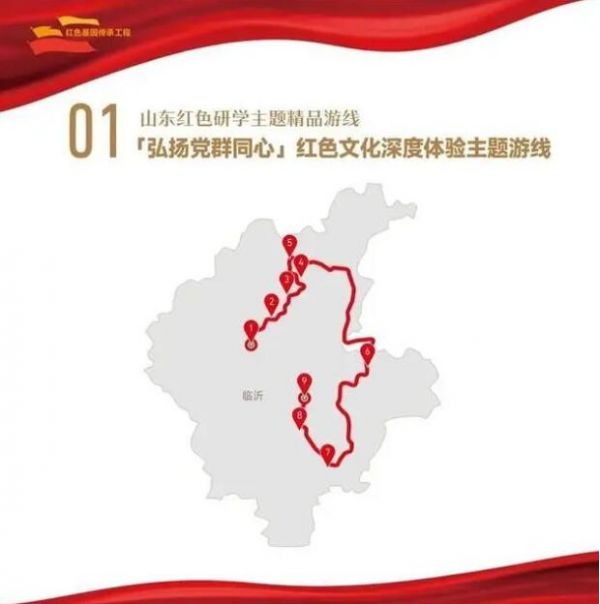 1. 臨沂市費縣大青山勝利突圍紀念館——2.臨沂市蒙陰孟良崮旅游區——3.臨沂市沂南山東紅嫂家鄉旅游區——4.臨沂市沂水桃棵子旅游區——5.臨沂市沂水中共中央山東分局舊址——6.臨沂市莒南山東省政府舊址暨八路軍115師司令部舊址——7.臨沂市臨沭紅色朱村——8.臨沂市蘭山華東革命烈士陵園——9.臨沂市河東華東野戰軍總部暨新四軍軍部舊址