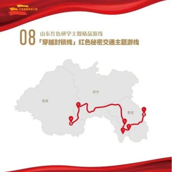 1. 棗莊市八路軍抱犢崮115師紀念園——2.棗莊市白樓灣運河支隊記憶館——3.濟寧市微山湖旅游區——4.棗莊市鐵道游擊隊景區——5.濟寧市魯西南戰役紀念館——6.菏澤市湖西革命烈士陵園