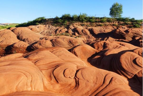 龍洲丹霞地貌其奇特的地貌和神奇的外觀令人嘆為觀止。紋理線條很是清晰,像一層層的海浪,環繞著起伏的小山丘形成了差異的走向,赤色的沙石在周圍黃土高原的映襯下顯得色彩濃郁,驚艷奇絕。