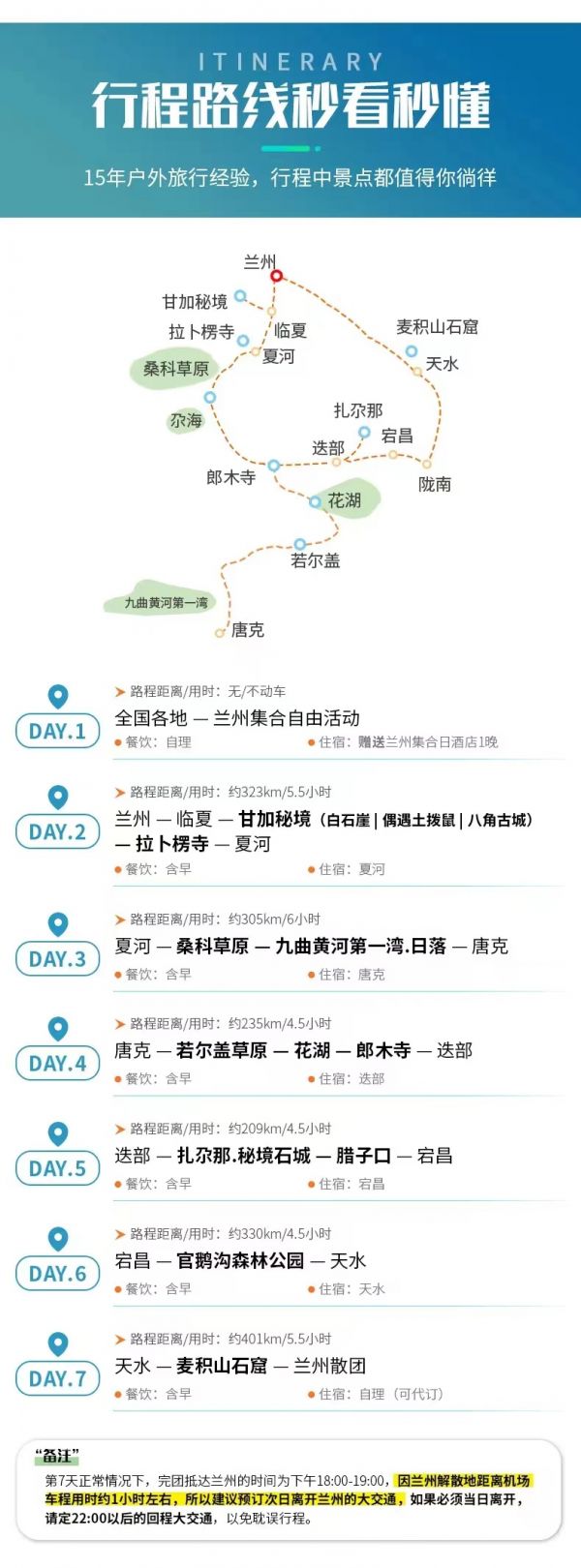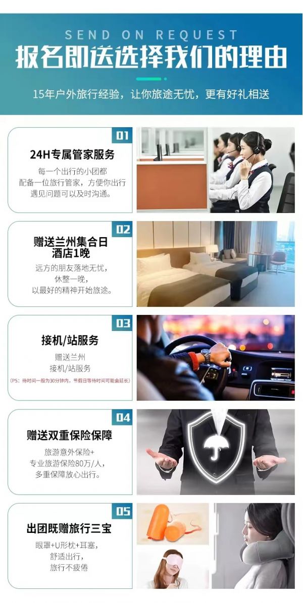 接站服務:2人及以上免費提供蘭州市區拼車接火車服務,接火車的工作人員會在您出發日期前一天21:30之前向您推送消息并與您聯系,如果超過時間沒有接到任何通知,請及時與領隊或報名處聯系。(節假日用車人數較多情況下客人等待時間可能會延長;我方會安排臨近航班拼車接站,如遇其他客人航班火車延誤晚點情況,等待時間可能會延長,敬請諒解)