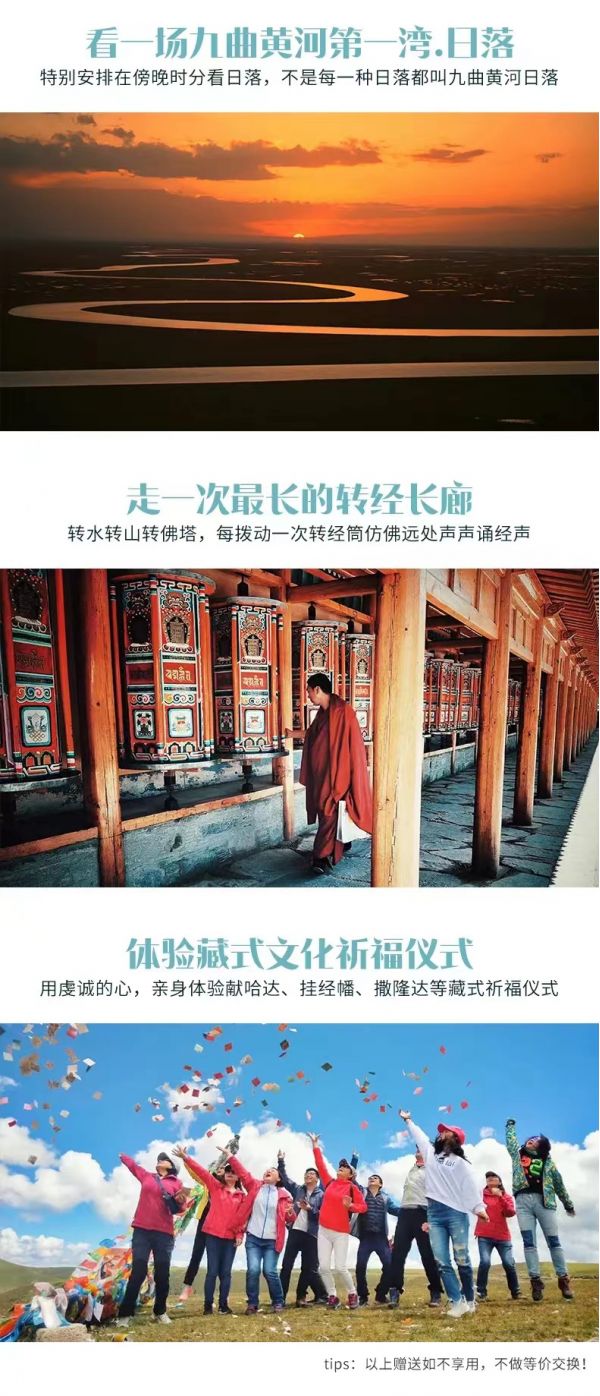 繼續往前【拉卜楞寺】,有“世界佛學院”之稱的【拉卜楞寺】。拉卜楞寺是藏傳佛教格魯派六大宗主寺之一 , 規模僅次于布達拉宮,是藏傳佛教格魯派最高佛學學府之一,被世界譽為“世界藏學府”,相當于我們眼中的“清華北大”。在漫長的發展中拉卜楞寺形成了獨特的藏傳佛教文化,包括建筑、學院、法會、佛教藝術、藏經等,曾經是甘、青、川毗鄰地區藏族的政治、宗教、文化中心。在學院堪布的帶領下來,進入寺院,欣賞美麗的壁畫、唐卡,精美佛像;走過朱紅玄黃長廊,和喇嘛一起撥動轉經筒;在這紅白相間的宏偉寺院中,看虔誠的信徒磕著等身長頭來此轉經;與僧人一起聽經、打坐,靜靜感受這份信仰的力量。而后經過【瑪曲】,母親河黃河這里自西南入境,復從西北出境。