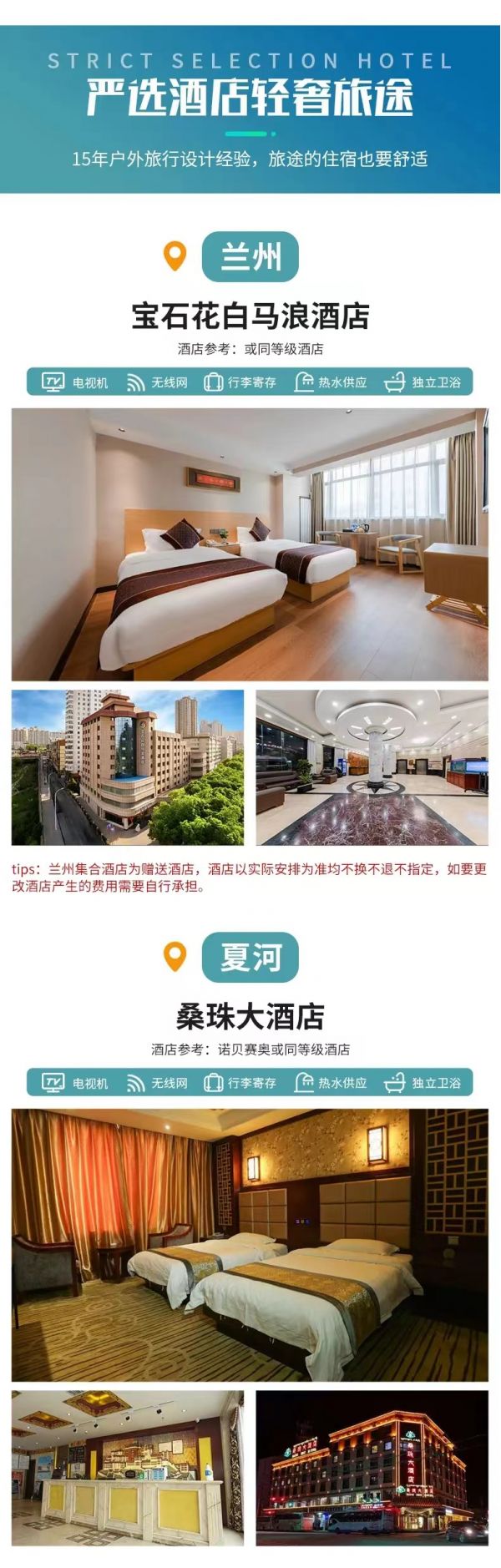 tips:蘭州集合酒店為贈送酒店,酒店以實際安排為準均不換不退不指定,如要更改酒店產生的費用需要自行承擔。