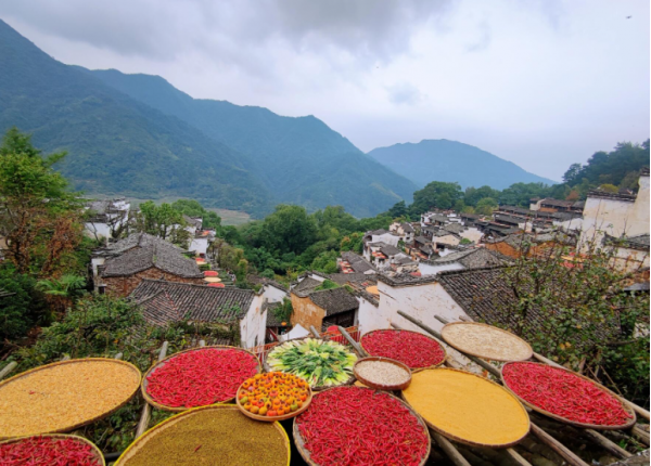 抵達(dá)篁嶺后,先前往篁嶺古村。這里有錯(cuò)落有致的徽派建筑,還有聞名的“曬秋”景觀。清晨的陽光灑在層層疊疊的曬匾上,色彩斑斕的農(nóng)作物構(gòu)成了極具特色的畫面。在古村的街巷中穿梭,拍攝古民居的木雕、磚雕、石雕等精美的建筑細(xì)節(jié)。