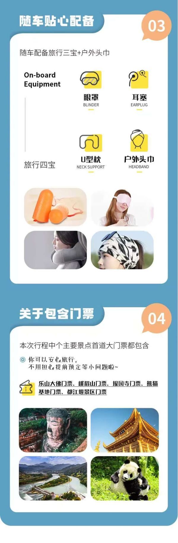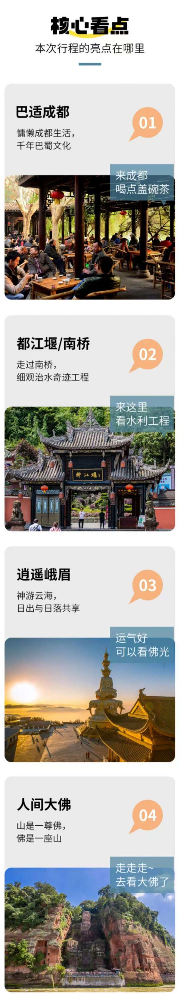 門(mén)票:樂(lè)山大佛門(mén)票、峨眉山門(mén)票、報(bào)國(guó)寺門(mén)票、熊貓基地景區(qū)門(mén)票、都江堰景區(qū)門(mén)票