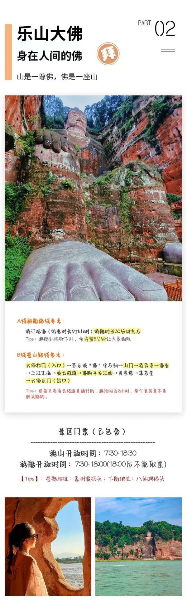午餐后乘車前往【樂(lè)山大佛】景區(qū),(門(mén)票已含,游覽約 1.5-2 小時(shí))。觀賞世界第一大彌勒坐佛--樂(lè)山大佛、凌云寺、九曲摘道、大雄寶殿、靈寶塔,在瞻仰樂(lè)山大佛宏偉氣勢(shì)的同時(shí),體驗(yàn)”蜀道難、難于上青天的感覺(jué)”,抱千年佛腳后,游漫山的石刻佛像。