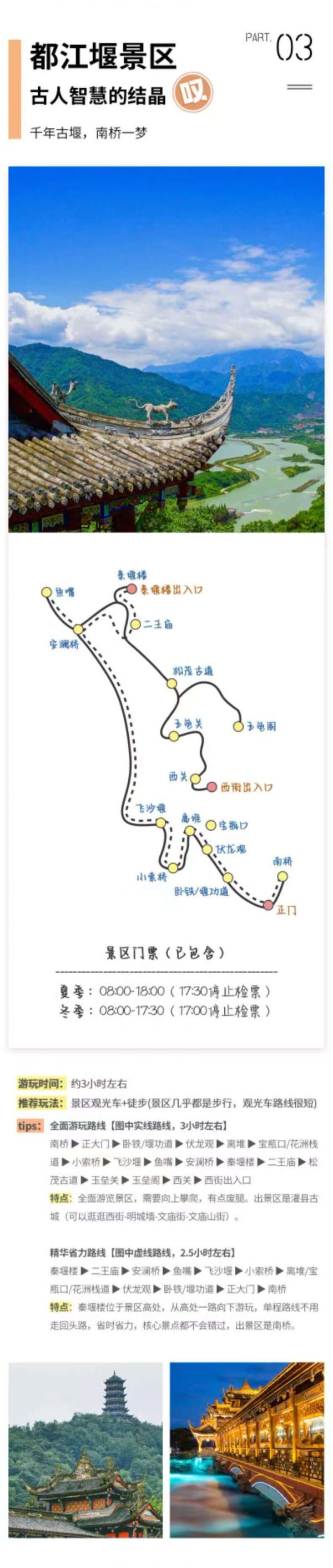 【都江堰】始建于公元前256年,是全世界至今為止年代最久、唯一留存的以無(wú)壩引水為特征的宏大水利工程,兩千多年來(lái),它一直發(fā)揮著防洪灌溉的作用,使成都平原成為水旱從人、沃野千里的天府之國(guó),登高望遠(yuǎn),看那悠悠草木間蜿蜒出一道道生命之源,直面古人的智慧結(jié)晶。景區(qū)內(nèi)可見(jiàn)壯觀的寶瓶口引水口、飛沙堰泄洪壩、觀魚(yú)嘴分水堤、安瀾索橋等工程,還可參觀5.12地震后重建的的秦堰樓、紀(jì)念李冰父子的二王廟,或是乘扶梯至玉壘閣觀都江堰壯麗全景。