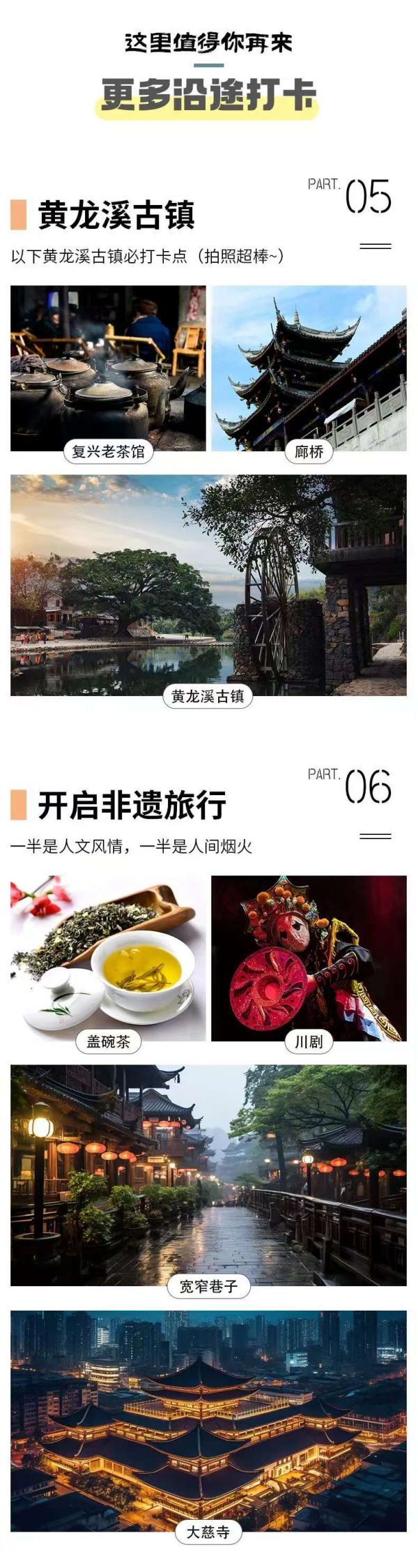 如果時(shí)間充裕,您【成都特色美食】有火鍋、缽缽雞、糖油果子、鐘水餃、龍抄手、紅糖鍋盔、還有各類“蒼蠅館子”,五花八門(mén),色味俱佳,來(lái)之前一定要做足功課!成都飲食偏麻、辣,一定注意不要暴飲暴食、吃太辣致腸胃不適。