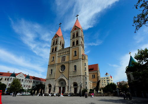 早7:00集合出發(fā),預(yù)計(jì)12:00到達(dá)青島天主教堂。后自由游覽,預(yù)計(jì)時(shí)間1小時(shí)。教堂以黃色花青島天主教堂崗巖和鋼筋混凝土砌成,表面雕以簡(jiǎn)潔優(yōu)美的紋案。窗戶為半圓拱形,線條流暢,顯得莊重而樸素。大門上方設(shè)一巨大玫瑰窗,兩側(cè)各聳立一座鐘塔,塔身高56米,紅瓦覆蓋的錐形塔尖上各豎立一個(gè)4.5米高的巨大十字架,塔內(nèi)懸有四口大鐘,一旦鐘樂鳴奏,聲傳數(shù)里之外。