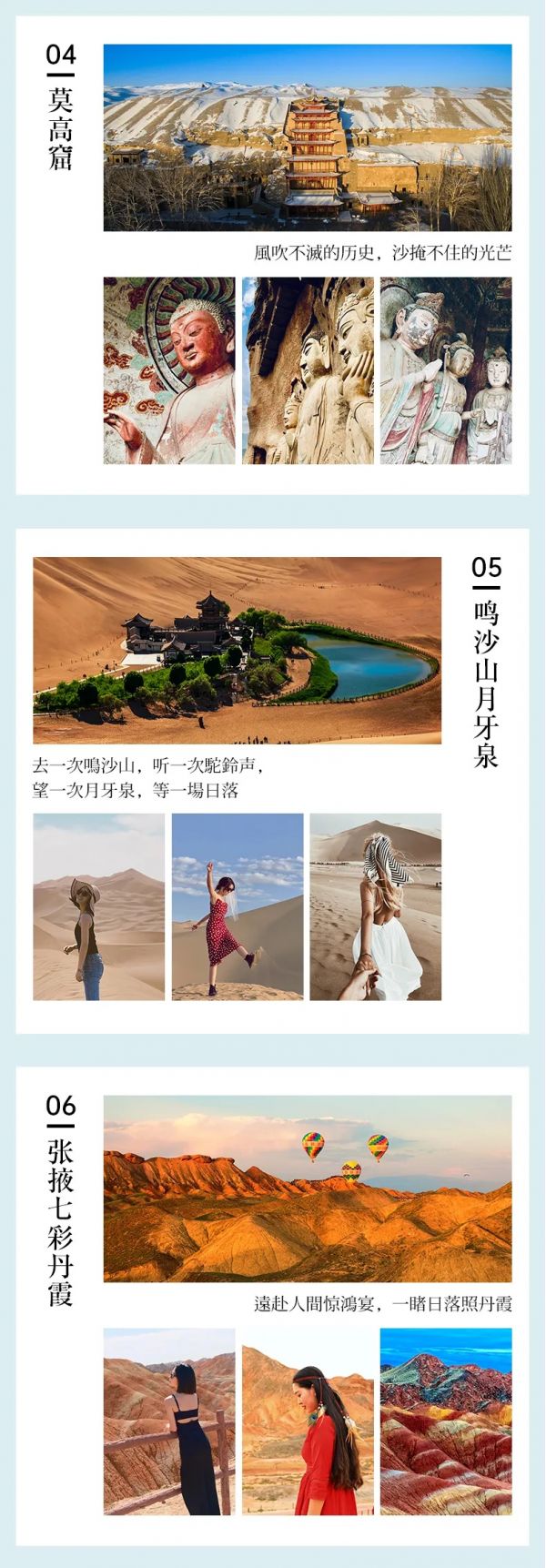 早餐后參觀游覽【莫高窟】參觀國家AAAAA級景區,莫高窟俗稱千佛洞,被譽為20世紀最有價值的文化發現。當你跟隨景區講解員參觀每個洞窟歷史、雕塑、壁畫時不禁會感慨萬千。莫高窟被評價為:世界上最長、規模最大、內容最豐富的畫廊,它是世界現存佛教藝術最偉大的寶庫。