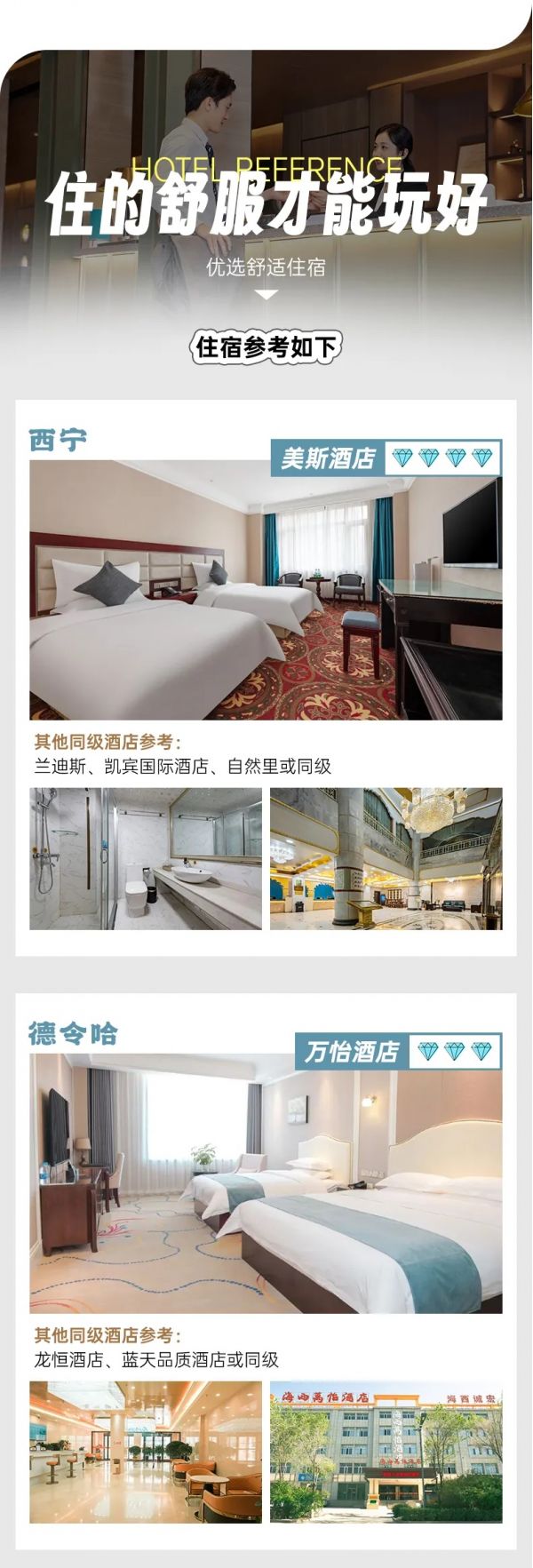 住宿:行程所列住宿地6晚住宿,每人1床位(含西寧集合日4鉆酒店1晚、不住不退不換不指定)具體了解團期價格。