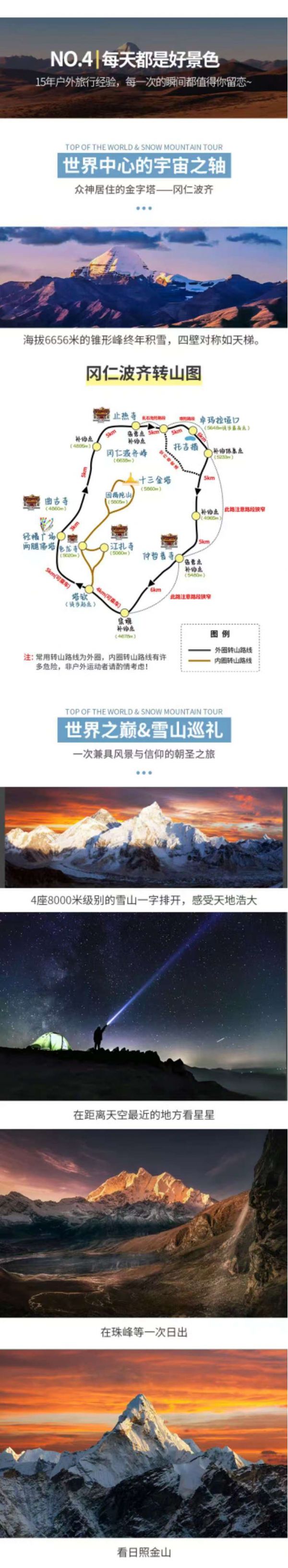 轉 山:薩嘎 - 瑪旁雍措 - 納木那尼峰 - 拉昂措 - 塔爾欽 - 岡仁波齊轉山起點(經幡廣場) - 止熱寺備注:塔爾欽之前是坐車行程,塔爾欽至止熱寺是徒步行程,如需背夫、向導費用自理。