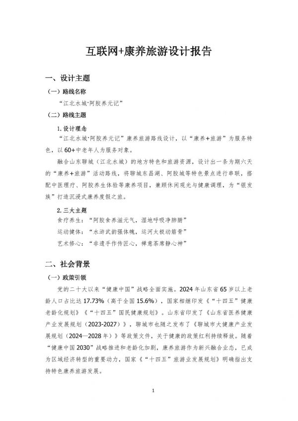 融合山東聊城(江北水城)的地方特色和旅游資源,設計出一條為期六天的“康養+旅游”活動路線,將聊城東昌湖、阿膠城等特色景點進行串聯,搭配中醫理療、阿膠養生體驗等康養項目,兼顧休閑觀光與健康調理,為“銀發族”打造沉浸式康養度假之旅。