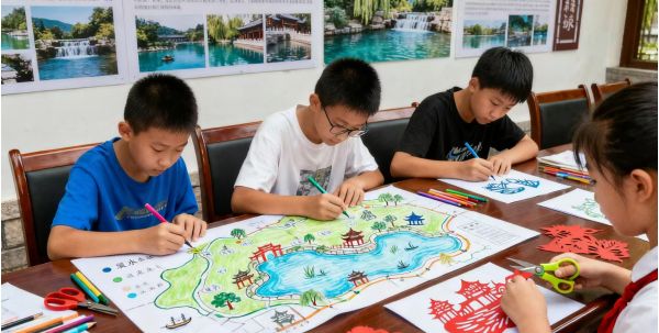 3、文化品讀與創作- 曲水亭街采風:漫步 “清泉石上流” 的街巷,觀察泉水人家生活場景,小組討論 “泉水如何影響濟南人的生活” 。 創意表達:結合研學所見所感,完成 “泉脈地圖繪制”(標注四大泉群位置及特色)或 “泉水主題手繪”(描繪最喜歡的泉景)。