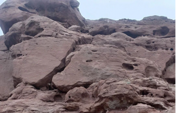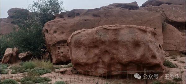 這些巖畫位于呼和溫都爾鎮(zhèn)西補(bǔ)隆嘎查炭窯溝口,周邊是白堊紀(jì)形成的紅色砂巖(因含氧化鐵呈紅色,硬度約四度)。