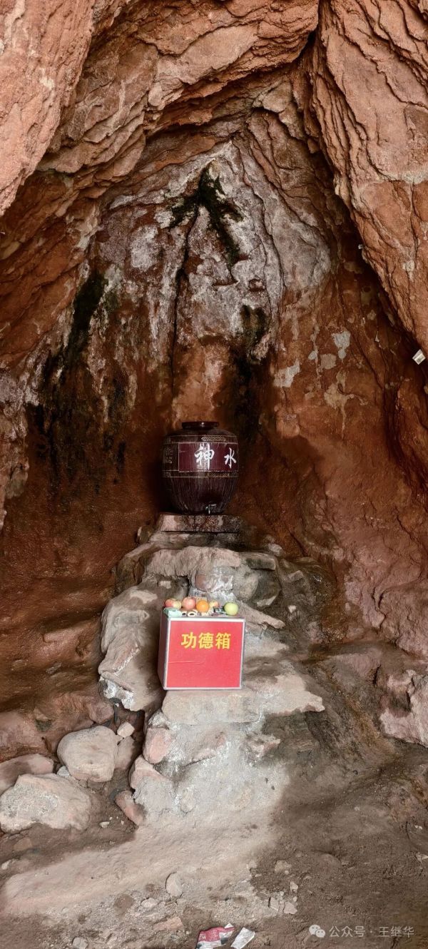 尋到神水洞時(shí),因是陰天,光線稍暗,卻絲毫不影響清冽的泉水從巖縫滲出,滴落在下方石罈里,泛著細(xì)碎漣漪。掬一捧泉水入口,涼意順著喉嚨往下淌,瞬間驅(qū)散了徒步的微熱。
