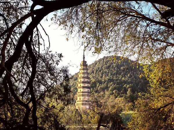 穿過千佛殿,辟支塔的身影在蒼松翠柏間傲然挺立。這座11層的樓閣式磚塔高約54米,塔身雕飾精美,每層都有錯(cuò)落有致的門窗和欄桿,塔頂?shù)南噍唽毶w在陽光下熠熠生輝。